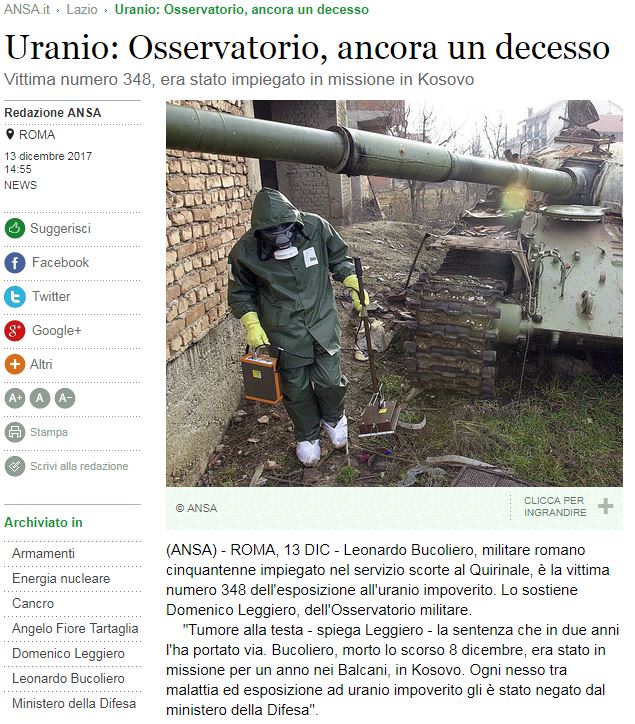 Италијанска новинска агенција АНСА објавила је (13. децембра 2017. г. среда) да је до сада 348 италијанских војника који су били у мировној мисији на Косову и Метохији умрло од последица уранијумског зрачења (тровања).