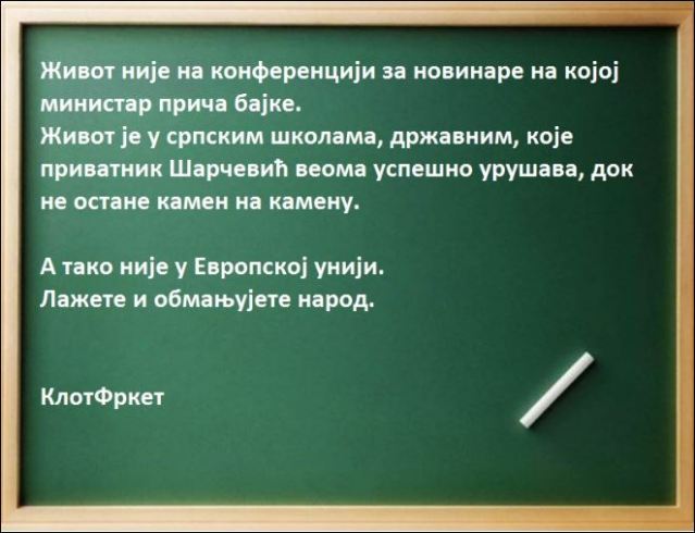 Ovaj ministar Sarcevic je najblaze receno „korisni idiot“ Zapada, mada bih za njega upotrebio samo drugu rec koja je napisana pod navodnicima. Dzaba mu njegovo licno obrazovanje, kada se on predstavlja kao veoma nemoralan covek i veliki stetocina u drustvenom miljeu Srbije! Vucic je bas nasao poslusnike da dokrajce prosvetu i kulturu. Ovaj mediokritet Sarcevic je vec na pocetku svoje ministarske karijere pokusavao da u srpski obrazovni sistem sve ono sto je dekadentno u homoseksualnoj i lezbejskoj, razvratnoj Evropi. A kada su gradjani poceli da negoduju sto mu (po Sarcevicevim recima) neke ‘ljubicaste“ NVO aktivistkinje, koje primaju plate i u Ministarstvu prosvete i kulture Srbije prave „udzbenike“ koji ce osnovce i srednjoskolce pretvarati u buducu plejadu onih koji ce se rado ukljucivati u razne „parade ponosa“, on se „ogradio“ da „nije znao sta mu rade te lezbos – aktivistkinje!“ Pa kad tako misli, najbolje je da za svoju porodicu osnuje jedno privatno obdaniste u kome ce od svojih unuka i unuka svojih najblizih rodjaka pripremati „kadrove“ koje ce ta EU-ropa rado prihvatati!