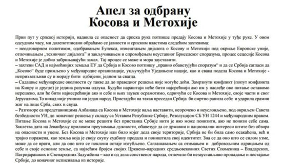 Први пут у српској историји, надвила се опасност да српска рука потпише предају Косова и Метохије у туђе руке. У овом одсудном часу, ми долепотписани обраћамо се јавности и српским властима следећим захтевима: