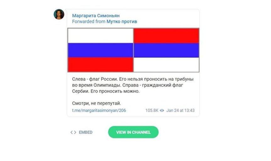 „Лево је застава Русије. Не може се уносити на трибине за време Олимпијаде. Десно је застава Србије. Она се може носити“, написала је главна уредница Спутњика Маргарита Симоњан на Телеграму.