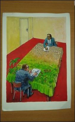 Говорећи, са усхићењем, о победничкој карикатури, члан жирија Слободан Срдић је истакао да карикатура сама по себи много говори, јер се ту све види, али се и оставља простор за ширу визију преговора. Она се, наиме, одвијају испод бичева, а њихов резултат зависи од људи који стоје изнад. Преговарачи су, по тумачењу Срдића, попут лавова, осетљивих на ударе бичем.