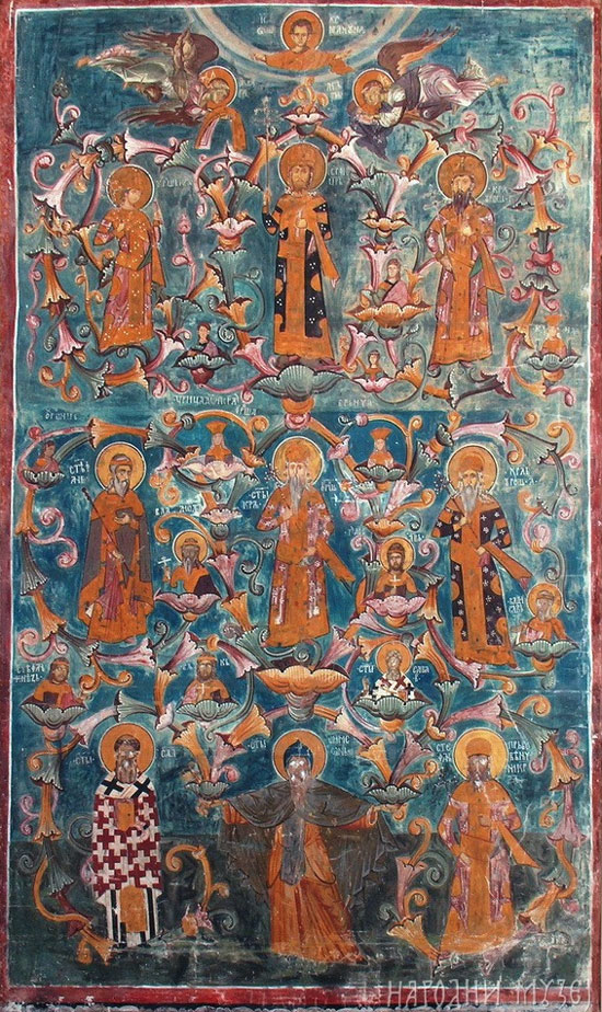 И Милорад Екмечић наглашава да је на Балкану, почевши од продора Турака у XIV и XV веку, а у остаку Европе од почетка верских ратова у XVI веку, вера постала кључна одредница идентитета, важнија од језика или свести о етничком пореклу.[67] Сасвим у духу етносимболистичких тумачења, предања и култови, нарочито српских светитеља, чинили су основ посебног идентитета Срба. Да су их Руси препознавали по култовима Светог Саве, Светог Симеона и Светог кнеза Лазара, сведочи и то што су управо ови свеци приказани на фрескама московског Архангелског сабора, у доба цара Ивана IV Васиљевича (Грозног), унука Српкиње Ане Јакшић и праунука Стефана Јакшића Старијег. Обимна светска хроника, Лицевой летописный свод, састављена за овог цара, садржи детаљне описе и илустрације из живота Светог Саве, Светог краља Стефана Дечанског и Косовске битке.[68]