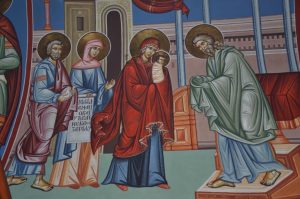 Држећи Исуса на рукама, она преклони колена пред Господом, и са великом побожношћу и страхопоштовањем приношаше га и предаваше Богу, говорећи: