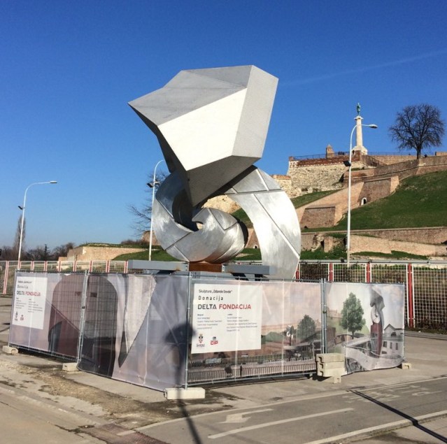 Ових дана делимично је обелодањена пешачка спона између Савског кеја и Калемегданског платоа. Заправо приказан је њен скулптурни сегмент већ допремљен на локацију и спреман за постављање у оквир ПАСАРЕЛЕ која ће једним делом садржавати мост над улицом, а онда се настављати пешачком и лифтовском вертикалом уз падину тврђаве. Овај громадни метални скулпторални објекат, изведен слободним обличјем, намењен је улози главног акцента нове комуникације и, благо речено, зачуђује својим димензијама од којих десет метара висине припада постољу, а седам метара скулптури аутора Мрђана Бајића и британског вајара Ричарда Диксона. Та скулптура од седамнаест метара, што приближно одговара висини петоспратнице, свакако ће изазивати подозрив поглед Победника и његову нелагоду присуством новог наметљивог пре уљеза него суседа.