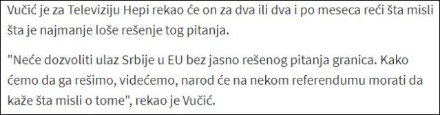 Наиме, његова намера, како видим читаву ову нашу политичку папазјанију, базираће се на томе да скине одговорност са себе и да на намештеном и изрежираном референдуму заведени, уцењени, изманипулисани и покрадени народ доведе у такву ситуацију да гласа за признање Космета. Како је то могуће, питате се ви? А, зашто није могуће, питам ја вас? Ако може да намести и покраде изборе, зашто не би он могао да намести и покраде референдум? Поготово ако питање на референдуму буде тако подло постављено да ће грађани бирати између свог стандарда и будућности своје деце и Косова које је, како режимска пропаганда буде приказала, већ изгубљено и како треба ставити тачку на тај део историје. То су те болне одлуке пред којима ће се грађани Србије да нађу и које је Драмосер одавно најавио. Сада улазимо у фазу њиховог доношења.