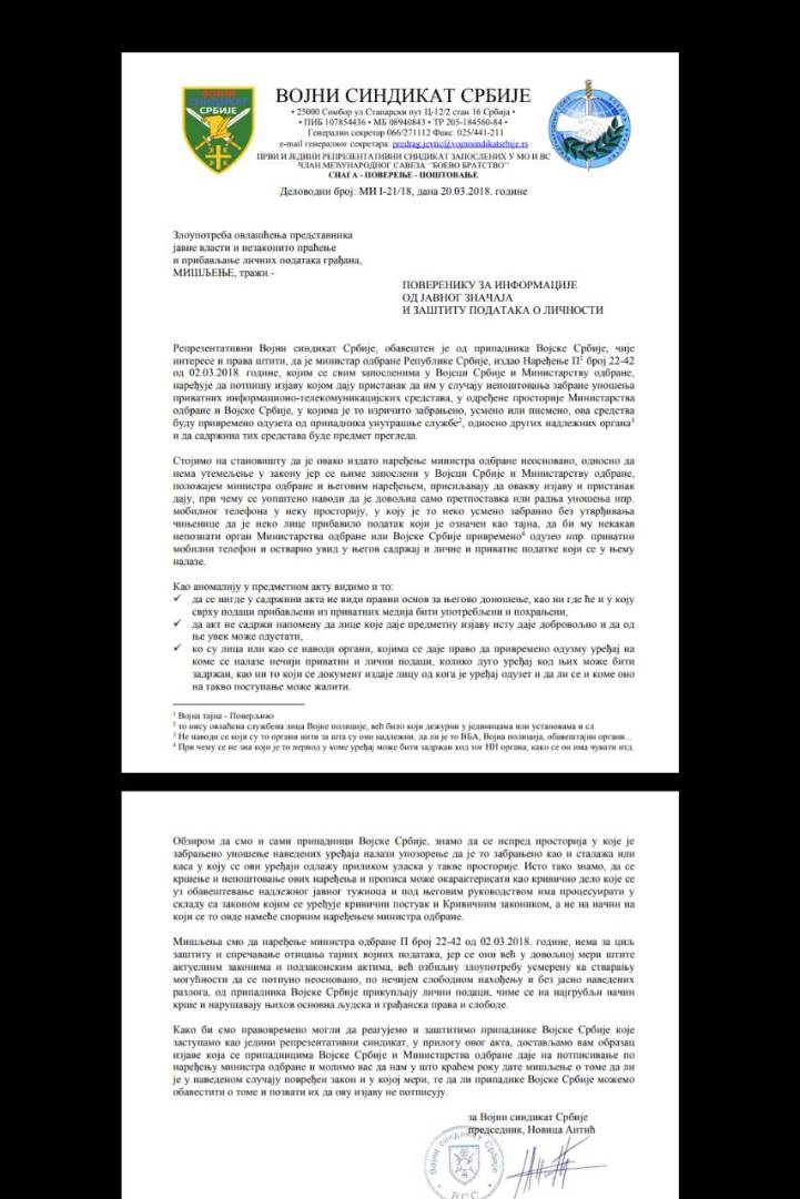 Војни синдикат Србије, обратио се Поверенику за информације од јавног значаја и заштиту података о личности и затражио његово мишљење како би адекватно заштитио права и интересе припадника војске које заступа као једини репрезентативни синдикат.