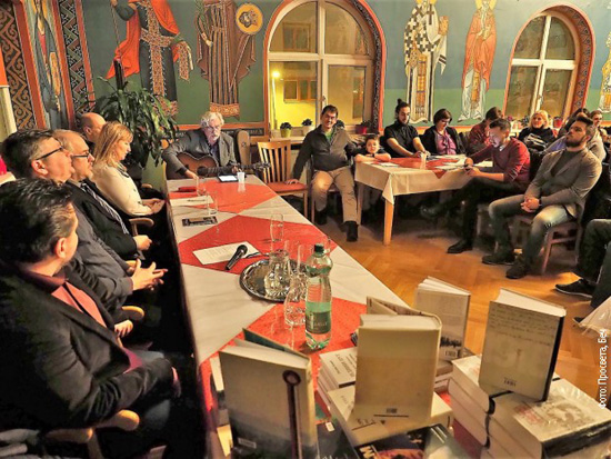 Тим поводом познати српски историчар проф. др Милош Ковић, са Филозофског факултета у Београду био је гост Просвјете и одржао предавање: Косово и Метохија – Сумрак Европе, пише у саопштењу Просвјете из Беча.