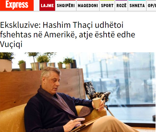 „Газета Експрес“ сазнаје да се председник Косова, Хашим Тачи, налази у Сједињеним Америчким Државама, на путу који је држао у тајности неколико дана. Пре неколико дана је објављено да је председник Србије, Александар Вучић, ненајављено отпутовао у Сједињене Америчке Државе. Опозиционе странке из Београда оптужиле су Вучића да је укључен у тајне преговоре са Хашимом Тачијем, прво у Паризу, а касније и у САД. Раније је престижни аустријски лист „Стандард“ известио да су њих двојица укључени у разговоре у вези са поделом Косова, али је ова опција забрањена након интервенције Берлина.