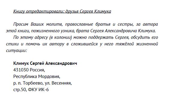 Сергей Климук не сдаётся, он пишет стихи и прозу, много читает, занимается самовоспитанием и духовным поиском. И верит в торжество справедливости.