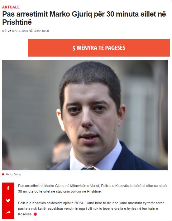 „У пратњи велике колоне возила косовске полиције, директор канцеларије за Косово и Метохију Марко Ђурић, кренуо је према прелазу Мердаре, где ће бити предат властима Србије. Очекује се да ће полиција Косова, у координацији са надлежним тужилаштвом, донети одлуку о мерама које ће предузети према Ђурићу а међу њима се помиње могућност сталне забране,“ навела је агенција Бета.