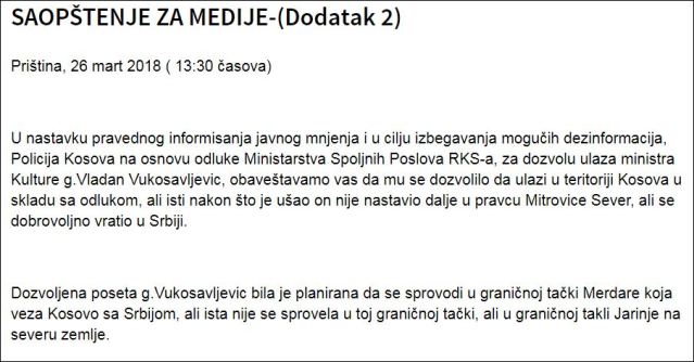 „У наставку јавног информисања и како би се избегле могуће дезинформације, Косовска полиција, на основу одлуке Министарства спољних послова РКС-а, омогућила је министру културе Владану Вукосављевићу улазак на територију Косова, у складу са одлуком, али исти, након уласка, није наставио даље за Северну Митровицу, већ се сам вратио у Србију. Одобрена посета господину Вукосављевићу је планирана да се догоди на граничном прелазу Мердаре, који повезује Косово и Србију, али се иста није догодила на овој граничној тачки, већ на граничној тачки Јариње на северу земље,“ стоји у саопштењу Косовске полиције.