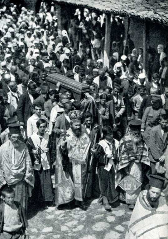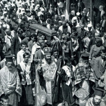 Срби и други православни вјерници у литији носе кивот са моштима Светог Јована Владимира 1929. године, предводи их епископ. (фото: Хуго Бернатзик, 1929).