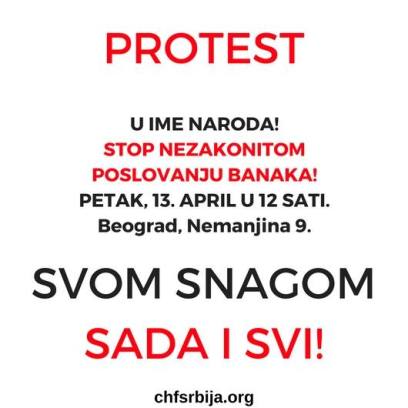 Управни одбор Удружења ЦХФ Србија позива све поштене грађане, а посебно све кориснике кредита, да се окупимо и сломимо безакоње, покажемо ко смо, шта знамо и шта хитно захтевамо – 13. априла, петак, у 12 часова, испред Апелационог и Врховног суда у Београду, Немањина 9.