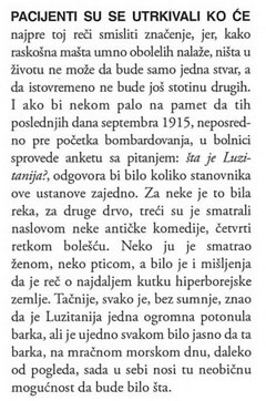 Нација је, тако, „једна савршена измишљотина, лоша литература” (стр. 156), „на овом поднебљу” осуђени смо на „неизлечиво понављање глупости”, „а уколико се глупост поткрепи што бројнијим и узалуднијим жртвама, утолико је више загарантовано њено понављање” (стр. 15), „овде кад се дете роди, њему се одма` каже да ће једног дана убити човека” (у рату), а и „свако дете што крај њега одраста, као и он, једнога ће дана убити човека” (стр. 26), ратовање српске војске 1912. године одликује „спаљивање кућа и дивљачко убијање и пљачкање становништва” по Албанији (стр. 127), када је „већина (убијених) била истерана пред велики зид и побијена куршумима”, а „понеко је убијан и у кућама, пољским клозетима и торовима за козе” (128), пожељни говор мајора Гавриловића требало би да гласи: „један по један шмугнућете иза ове кафане”, „а после куд који”, „да осветлате образ народа тако што ћете изучити корисне школе, створити добре породице и заувек се клонити војске и ратовања” (стр. 16), и томе слично.