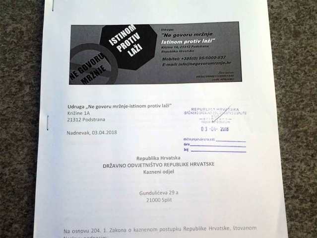 – Данас 3. травња 2018. године, на 49 страница са доказима, Удруга ‘Не говору мржње-истином против лажи’ поднијела је Државном одвјетништву Казнену пријаву против Колинде Грабар Китаровић, Андреја Пленковића, Дамира Крстичевића, Томислава Чорића и Бранке Иванчан Пицек (ДХМЗ), за суучесништво у геноциду над хрватским народом. Јер нису зауставили тровање грађана цхемтраилсом иако су уредно примали наше дописе… – наводе у овом удружењу.