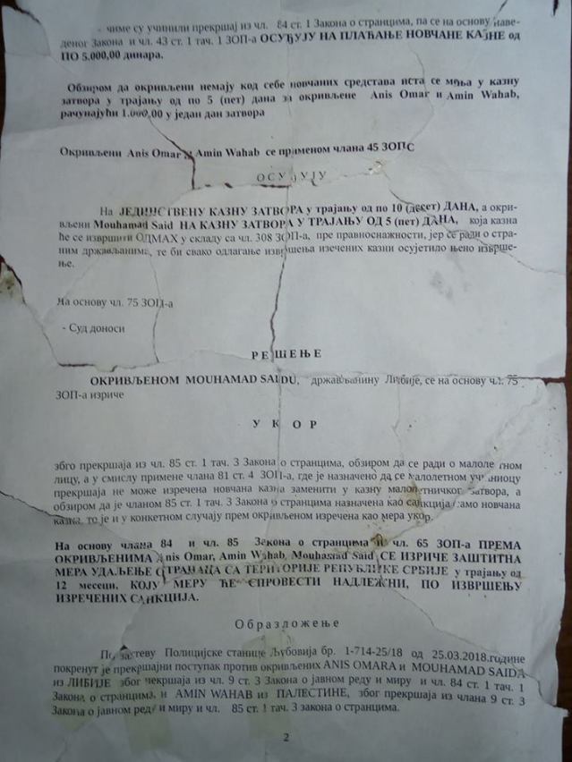 Тројица мигранта осуђени су за ремећење јавног реда и мира, на основу члана 43 става 1 истоименог закона.
