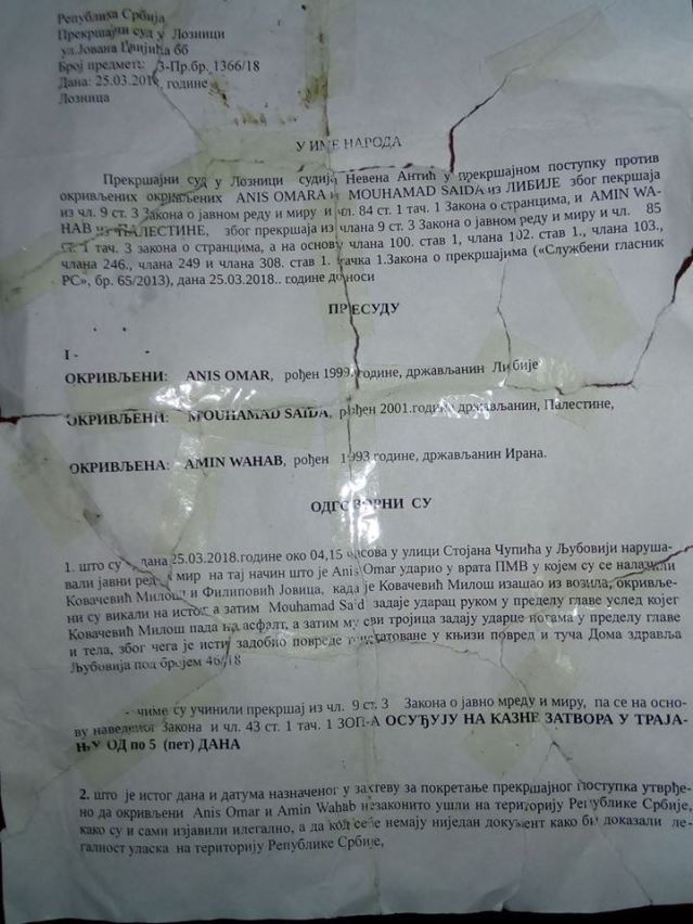 Анис Омар из Либије (рођен 1999. године) и Амин Вахаб из Ирана (рођен 1993. године), осуђени су за брутални напад на само 10 дана затвора. Обoјица су Србију ушли илегалним путем.