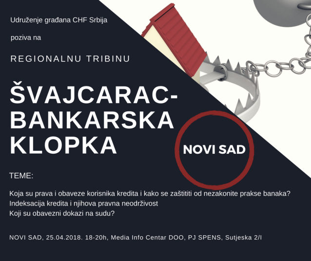 Удружење грађана за заштиту корисника банкарских услуга ЦХФ Србија, позива грађане и стручну јавност да дођу на Регионалну Трибину “ Швајцарац – банкарска клопка” у среду 25.04.2018. од 18:00 до 20:00 часова која ће се одржати у Медиа Инфо Центру, ПЈ Спенс, Сутјеска 2/I, Нови Сад и сазнају више о томе и темама:
