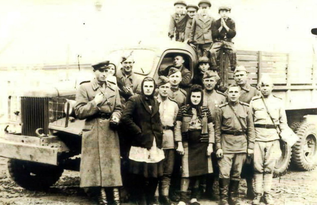Мокринске жене и њихова деца са својим ослободиоцима, совјетским официром и војницима Црвене армије, октобра 1944. године. Фото: Љубазношћу Драгољуба Бадрљице