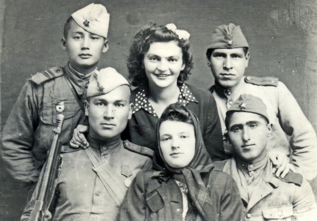 Аница Грађин и В. Татомиров са припадницима црвене армије у Мокрину, октобра 1944. године. Фото: Збирка Ацка Пејакова, љубазношћу Драгољуба Бадрљице.
