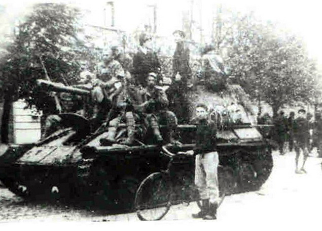 Једина позната публикована фотографија ослободилаца Петровграда (данас Зрењанин) октобра 1944. године, која је „преживела“ доба Брозовог режима и појавила се у колекцији Џона Трампија. На слици су грађани са тенкистима Црвене армије који су ослободили њихов град. Фото: Љубазношћу Слободана Милина.