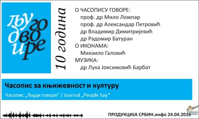 У препуној сали Србског културног центра „Ћирилица“ у Београду (Скерлићева 12) је обележења десетогодишњица часописа за културу „Људи говоре”, која окупља српске ауторе који живе и раде како у Србији, тако и широм света – од Канаде до Аустралије. Том приликом говорили су наши познати и значајни интелектуалци који пишу за тај часопис: др Радомир Батуран, уредник часописа „Људи говоре”, др Александар Петровић, редовни професор културне антропологије на Филолошком факултету у Београду, др Мило Ломпар, редовни професор Историје књижевности на Филолошком факултету у Београду, иконописац Михаило Галовиц, а др Лука Јоксимовић је гитаром и песмом додатно надахнуо присутне. Такође, глумац Лепомир Ивковић је прочитао есеј др Владимира Димитријевића, који је написан за ову прилику.