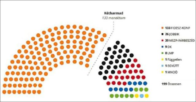 На парламентарним изборима 8.априла, наиме, десно-конзервативни Фидес у савезу са Хришћанско-демократском народном странком (КДНП) освојио је двотрећинску већину и у парламенту ће имати 133 посланика (од 199), или 66,83 одсто у укупном броју посланика. За победничку коалицију гласало је 2.448.175 бирача, то јест 48,84 одсто. На другом месту је десно-радикални Јобик са 26 парламентарних мандата (за њега је гласало 19,71 одсто бирача, или њих 988.158). Треће место заузимају социјалисти (МСП) заједно са „Дијалогом за Мађарску“ са 20 посланичких места (за њих је гласало 12,24 одсто бирача, добили су 574.918 гласова). Партија „Политика може бити другачија“ (ЛМП) четврта је са 6,82 одсто поверења бирачког тела и 320.491 гласом, док је пета странка (од 23 које су учествовале на изборима) која је прешла цензус (5,52 одсто) Демократска коалиција (ДК) некадашњег либералног премијера Ференца Ђурчања – освојила је девет мандата (за њу је гласало 259.329 гласача).