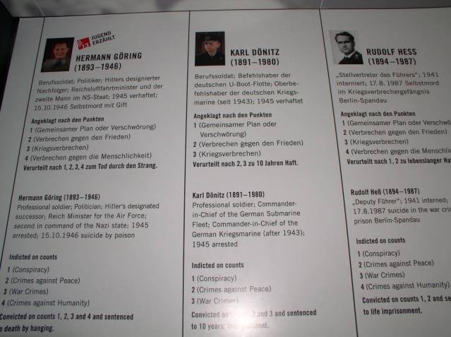 Ходали смо из просторије у просторију загледајући фотографије осуђених нацистичких вођа, са исписаним биографијама и побројаним злоделима. Херман Геринг, Карл Дениц, Рудолф Хес, Ерих Редер, Јоаким фон Рибентроп, Вилхелм Кајтел, Балдур фон Ширах, Ернст Калтенбрунер, Фриц Саукел и други. Неки осуђени на дугогодишње робије, неки на смрт вешањем. Геринг се отровао цијанидом пре него су стигли да га обесе. Човек који је у младости био један од летачких асова из Првог светског рата, потом Хитлеров рајхсмаршал и заповедник Луфтвафеа, живот је завршио као ратни злочинац и нирнбершки осуђеник. Међу црно-белим фотографијама уморених нациста, налазила се и његова након тровања, у лежећем положају, са тврдим укоченим погледом у метафизичку празнину до које га је довела идеологија.