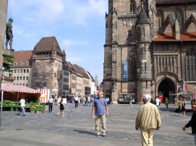 Није нам дуго требало до центра града, након десетак минута пешачења по силаску из аутобуса обретосмо се на широком калдрмисаном простору којим је доминирала велика готска црква Фрауенкирхе (Frauenkirche). У Звонару богородичине цркве Виктор Иго је рекао да се у читавој Европи задржало свега неколико потпуно и хомогено готских вароши – Париз, шпанска Виторија и Нирнберг. Наспрам обиља хетерогености с којима смо се суочавали претходних дана Нирнберг је одиста зрачио нечим целовитим и хомогеним, древни германски дух овде се осећао јаче и аутентичније од било ког града кроз који смо до тада прошли. Иако су слојеви потоњих епоха сасвим сигурно изменили лице града какво памти Иго, све је овде одисало аутентичном немачком старином. Чак су и житељи деловали изразитије, као да су се у њима потпуније очували дух и гени правих, предмодерних Немаца. Када смо их припиткивали за ову или ону локацију осећало се у њиховом тону нешто живље и присније од уобичајене хладне љубазности, били су искрено заинтересовани да објасне и помогну, неке је чак занимало ко смо и одакле смо. Изгледало је да у Нирнбергу нема ни сувише тамнопутих, град је деловао попут ретке хриди на сред глобалистичког океана која је одолевала мешању и безличењу. Сав гранитно мрк и постојан, са јаким опругама на јаким темељима, или као што би рекао Андерсен: “Нирнберг личи на оне старце у којима је младост још увек жива, којима су мисли довољно покретљиве да се могу везати за идеје младости“.[3]