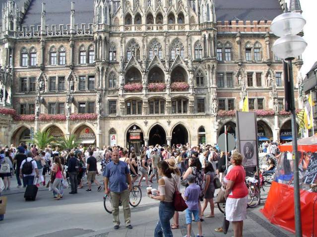 Најзад избисмо на Мариен плац (Marien platz – Маријин трг), строги центар Минхена, посвећен Девици Марији чији се споменик у злату издизао на високом стубу испред Нове градске већнице – широког здања загасите боје са мноштвом готских шиљака. Иако је грађевина изгледала веома старински, заправо је била довршена тек почетком XX века, верним поштовањем обрасца готске архитектуре. Недалеко од ње налазила се Стара градска већница из XV века, рушена па реновирана, где је Гебелс 1938. године одржао говор који се сматрао уводом у Кристалну ноћ. На супротном крају трга налазила се Катедрала Наше Госпе (Frauenkirche), са високим торњевима и зеленим куполама. У стара времена овде беше средиште градског живота у коме су се одигравали сви значајнији догађаји, па и јавна вешања на смрт осуђених. Читав простор, којим су промицале велике масе људи, представљао је острвце старог Минхена, древне баварске престонице, давно ишчезле под слојевима индустријске, модерне и космополитске метрополе, после Франкфурта на Мајни највеће гастарбајтерске Меке.