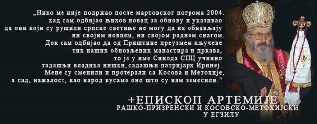 Сукоб цркве и њеног слуге је толико сложен и дубок да осликава сву суштину кризе у коју су запали српско друштво и СПЦ. Владика Артемије је од цркве тражио да се врати канонским законима који су утемељени на учењима Господа Исуса Христа, Светог Саве, Максима Исповедника, Јустина Поповића и других светих отаца, и да се одрекне екуменизма. Тражио је да црква одлучно брани Косово и Метохију. (Међутим) Држава и црква су одлучиле да тргују Косовом, а Артемијеве ставове прогласе за јерес?!