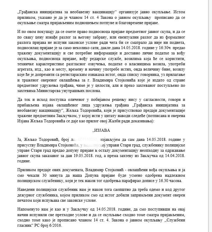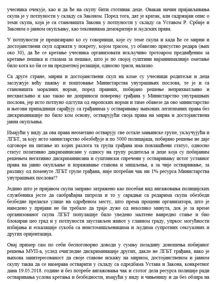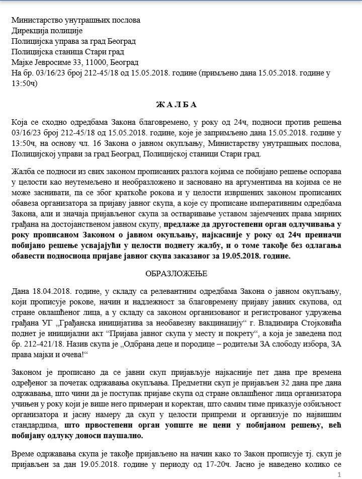 организатора, поводом покушаја ЗАБРАНЕ уредно пријављеног и од стране ПУ „Стари град” – ОДОБРЕНОГ Сверодитељског протеста заказаног за 19 .мај 2018.г у 17ч на Тргу Републике у Београду: