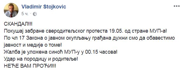 „У складу сачланом 17. Закона о јавним окупљањима ОБАВЕШТАВАМО јавност да нам је дана 15. маја 2018. у 13:50ч достављена Одлука главног саветника ПУ „Стари град” Ђокице Драшковића, о ЗАБРАНИ одржавања благовремено и уредно (месец дана раније) пријављеног родитељског скупа.