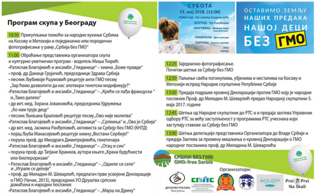 Јавни скуп у покрету „За Србију без ГМО – Марш против Монсанта“ биће организован у Београду на Тргу Републике у суботу 19. маја од 10 часова и 30 минута. Организатори скупа су: Друштво српских домаћина, Савез пољопривредних инжењера и техничара Србије (СПИТС) и УГ Здрава Србија и Ко нам трује децу.