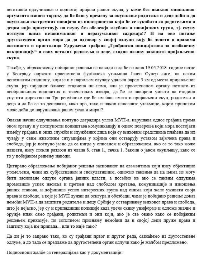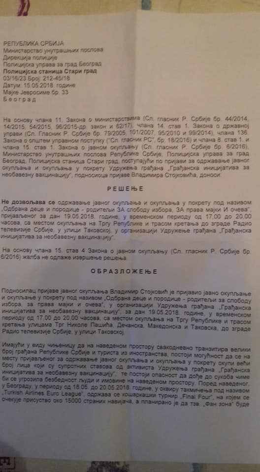 Већ заказан протестни скуп родитеља за 19.05.2018. године у Београду, са почетком у 17 часова, напрасно је забрањен од стране власти Србије због како се наводи “високог ризика”. Тачније, у смушеном и невешто сроченом решењу стоји: “… да окупљање није дозвољено када постоји угрожавање безбедности људи и имовине, јавног здравља, морала, права других или безбедности Републике Србије…”