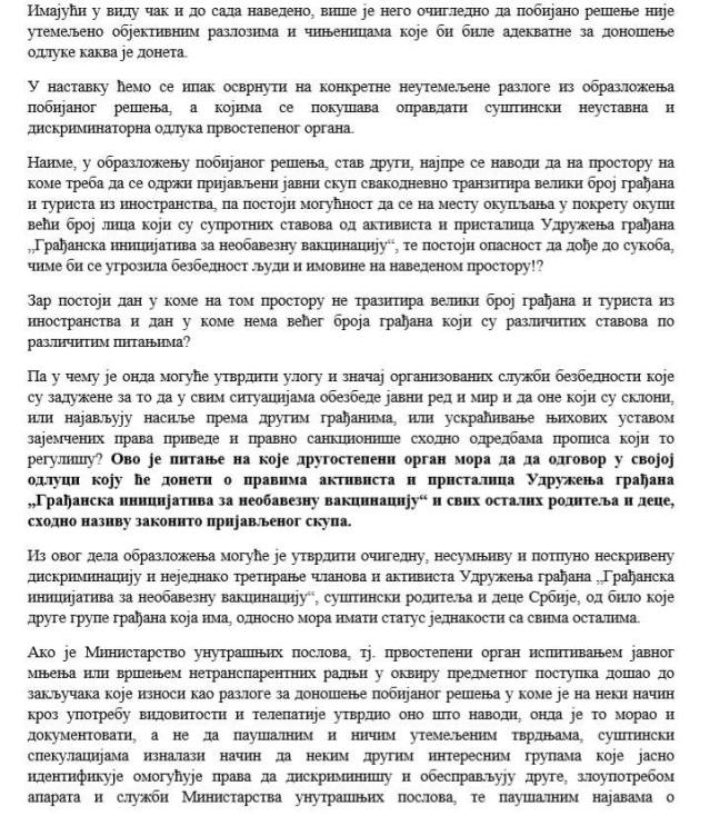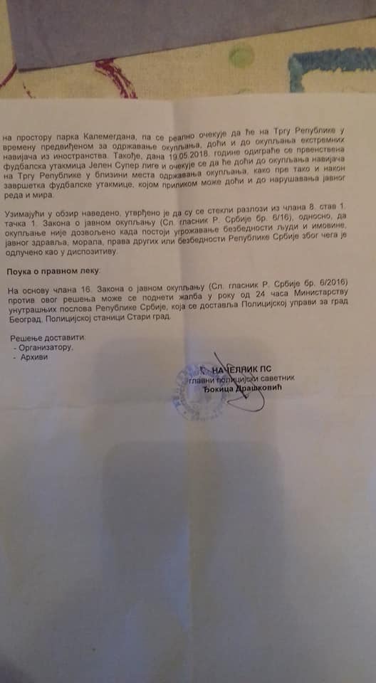 за град Београд, Полицијска станица Стари град ретко је (ако се то уопште икада и догодило) забрањивала било какав скуп, а било је и врло бизарних који су и заиста били високо ризични. Тешко је поверовати да држава, која би бар декларативно требала да штити права свих а не само неких (нарочито деце, родитеља, угрожених слојева становништва) – то не чини али ево још једног еклатантног примера да су институције спржене до темеља и да је само фикција оно што нам се приказује у задатим термиинима извршне, судске и нарочито законодавне власти.