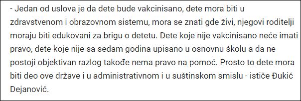 – Један од услова је да дете буде вакцинисано, дете мора бити у здравственом и образовном систему, мора се знати где живи, његови родитељи морају бити едуковани за бригу о детету. Дете које није вакцинисано неће имати право, дете које није са седам година уписано у основну школу а да не постоји објективан разлог такође нема право на помоћ. Просто то дете мора бити део ове државе и у административном и у суштинском смислу – истиче Ђукић Дејановић.