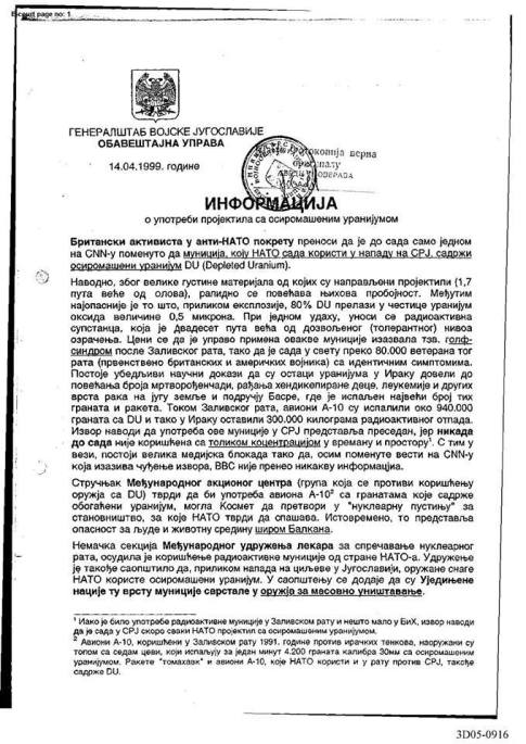 У званичном документу Генералштаба Војске Југославије од 14.4.1999.године, под насловом „ИНФОРМАЦИЈА о употреби пројектила са осиромашеним уранијумом“ наведено је да је британски активиста у анти-НАТО покрету пренео да муниција коју „НАТО сада користи у нападу на СРЈ, садржи осиромашени уранијум DU (Depleted Uranium)“. Оно што је наглашено је опасност од те муниције која „приликом експлозије – 80% DU прелази у честице оксида величине 0,5 микрона“. Човек при једном удаху „уноси радиоактивну супстанцу која је двадесет пута већа од дозвољеног нивоа озрачења“. Постоје убедљиви научни докази да су остаци уранијума у Ираку довели до повећања броја мртворођенчади, рађања хендикепиране деце, леукемије и других врста рака на бомбардованим подручјима. Током Заливског рата авиони А-10 испалили су око 940.000 граната са DU и тако у Ираку оставили 300.000 килограма радиоактивног отпада.