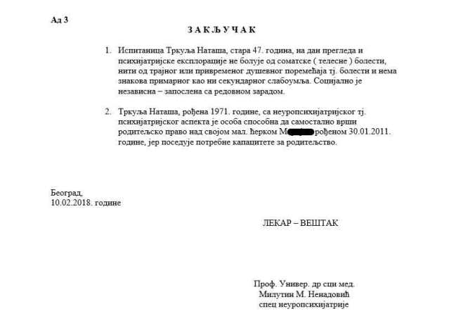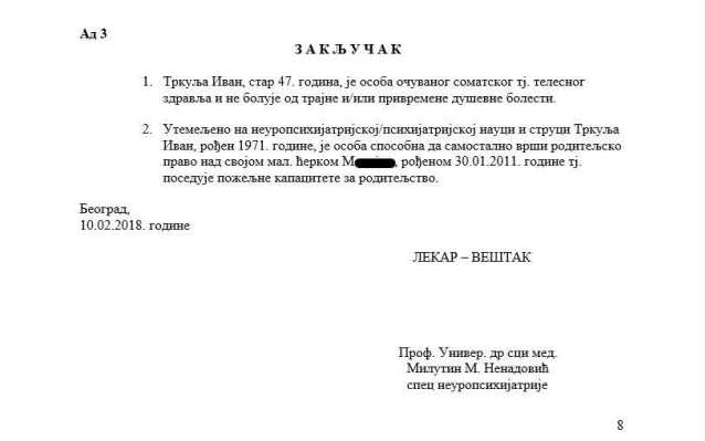 Иван и Наташа Тркуља, којима је Градски центар за социјални рад града Београда, одељење Звездара, 03.10.2017. одузео ћерку у раним јутрањим часовима на препад и асистенцију полиције без икаквог писмена (документа) у њиховом стану, а који и даље воде херојску борбу епских размера да им се дете врати, извршили су и експертско вештачење од стране СТАЛНОГ СУДСКОГ ВЕШТАКА Проф. Универзитета др сци мед. Милутин М. Ненадовић, спец. неуропсихијатрије, Судски вештак за област: медицина, ужа специјалност: неуропсихијатрија, епилептологија и болести зависности.