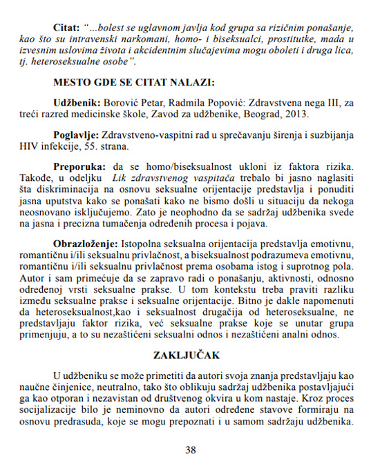 - Затим, Брисел у свом извештају „о напретку Србије (на ЕУ путу)” напише „да је потребно изменити школске уџбенике који садрже дискриминаторски садржај (према ЛГБТИ особама)” (2016; овде, стр. 74; слично и овде, стр. 37).
