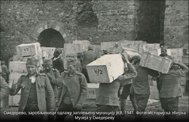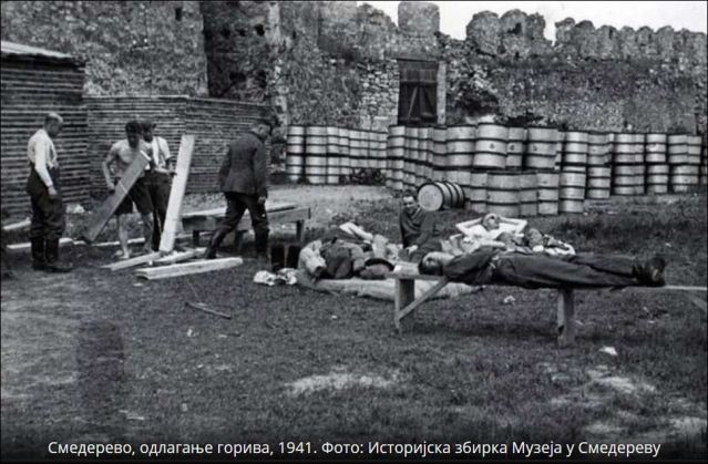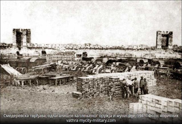 Наредбом окупационих власти, смедеревска тврђава је 1941. године одређена за ропотарницу остатака војне силе Краљевине Југославије. Дунавом, са истока и запада, возовима од Скопља, Ниша и Крагујевца, старим Цариградским друмом, запрегама и камионима, довожено је на тоне одбачених сандука муниције, граната, бурад са барутом, којих је било на вагоне, експлозивна пушчана муниција, авионске бомбе, гранате, парафин, пушке, митраљези, топови, запрежна возила, понтонски чамци и војничка одела. Осим тога, ускладиштено је и преко 1.000 буради од по 200 литара бензина.