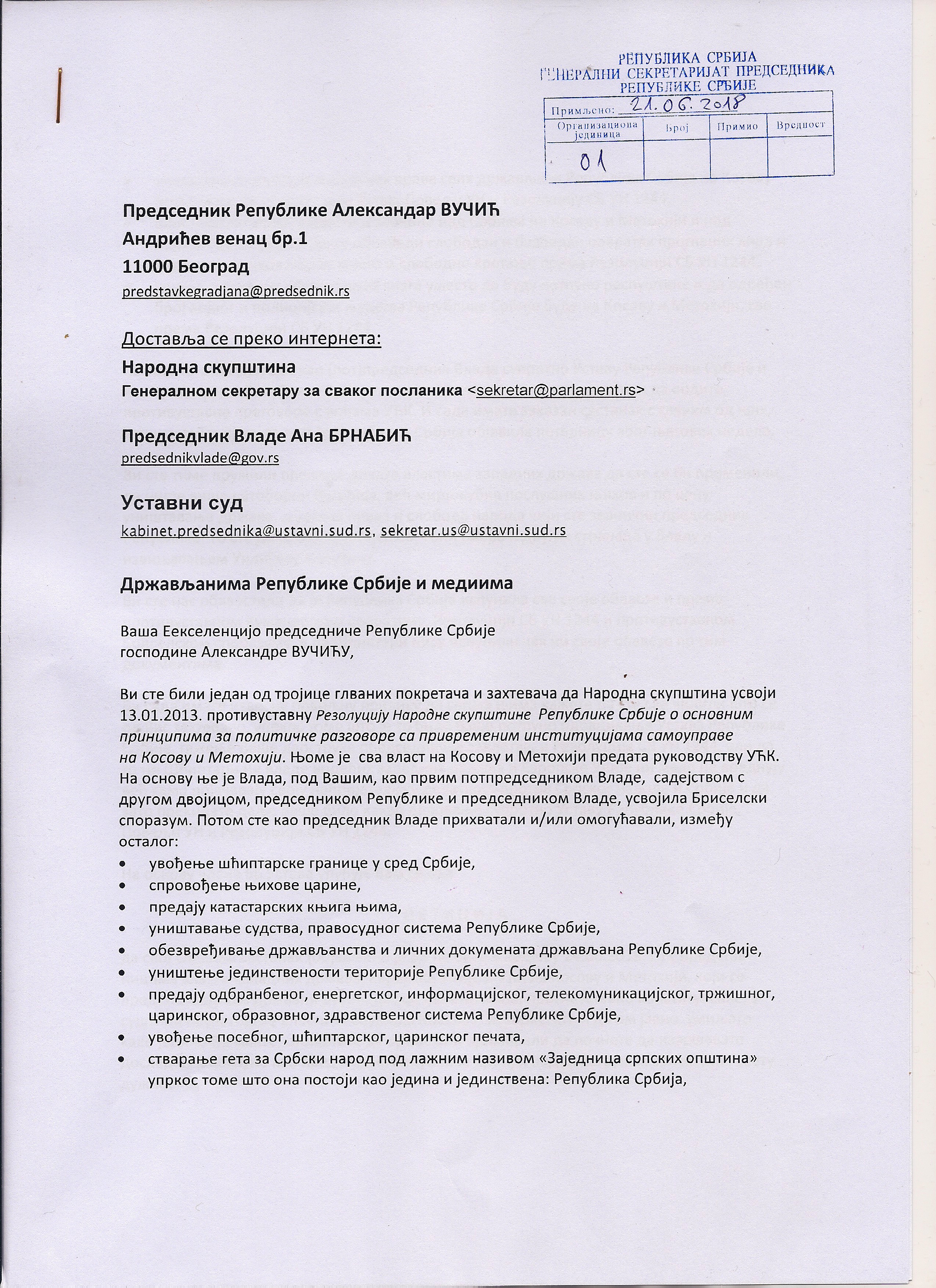 да свој следећи састанак (објављено је да ће бити у недељу 24. 06. 2018. г.) с представницима власти западних држава, Европске Уније и УЋК на Косову и Метохији, који се представљају као државни руководиоци нелегитимне, противуставно конституисане, у суштини окупаторске власти «Репубљик Косова», искористите и да им јавно, умиљато како једино Ви умете, саопштите да су Вас они приморали да почнете да извршавате доследно и потпуно као председник Републике Србије, под двоструком заклетвом, свету дужност да:
