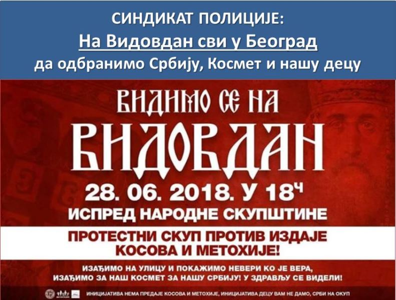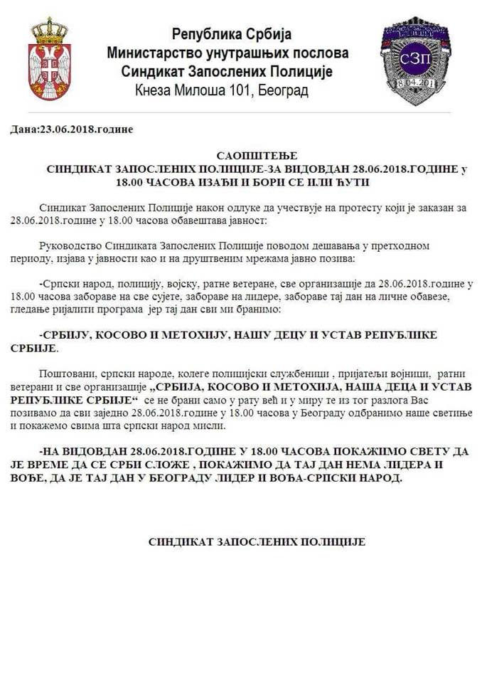 – На Видовдан 28.06.2018.године у 18.00 часова заборавимо на сујете, време је да сви будемо заједно јер смо ми ти који одлучујемо. Руководство Синдиката Запослених Полиције позива све организације које су заказале или имају у плану да закажу протесте 28.06.2018.године да уместо заказаних или планираних протеста, подрже и укључе се у протест који је заказан 28.06.2018.године у 18.00 часова и заједно одбранимо светиње „ СРБИЈУ, КОСОВО И МЕТОХИЈУ И НАШУ ДЕЦУ“.