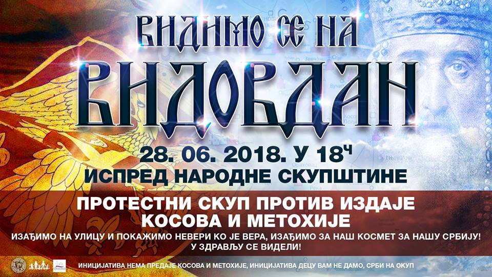 28.06.2018. год од 18ч испред СКУПШТИНЕ РЕПУБЛИКЕ СРБИЈЕ, на један од најзначајнијих датума у српској историји, позивамо народ да се одупре притиску, устане и каже НЕ како глобалистичким тако и намерама домаћих издајника да баце у ветар векове борбе српског народа за опстанак и слободу.