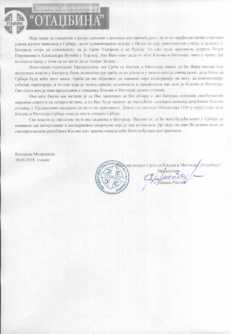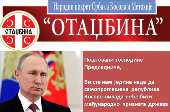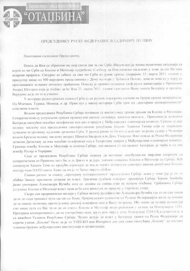 Скоро сви прорежимски медији у Србији истичу русофилство Александра Вучића, где се он сам хвали да се до сада тринаест пута састао са Вама. Пријатељским односима са Руском Федерацијом жели да покаже да за овакву политику према јужној српској покрајини има и Вашу подршку. Ми знамо да то није истина јер смо више пута од Вас чули да се статус Косова и Метохије мора решавати у складу са Резолуцијом 1244. Претерана кооперативност, да не употребимо неку другу реч, није у духу Резолуције 1244 СБ а супротна је и са важећим Уставом Републике Србије. Чудно делује да власт у Београду тражи од Руске Федерације да спречи улазак „Косова“ било да је то УНЕСКО или Интерпол док она сама омогућава „Косову“ да постане чланица бројних међународних институција и организација.