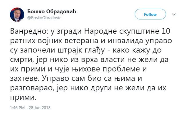 „Ванредно: у згради Народне скупштине 10 ратних војних ветерана и инвалида управо су започели штрајк глађу – како кажу до смрти, јер нико из врха власти не жели да их прими и чује њихове проблеме и захтеве. Управо сам био са њима и разговарао, јер нико други не жели да их прими.“