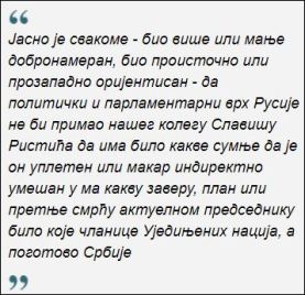 Јасно је свакоме – био више или мање добронамеран, био происточно или прозападно оријентисан – да политички и парламентарни врх Русије не би примао нашег колегу Славишу Ристића да има било какве сумње да је он уплетен или макар индиректно умешан у ма какву заверу, план или претње смрћу актуелном председнику било које чланице Уједињених нација, а поготово Србије.