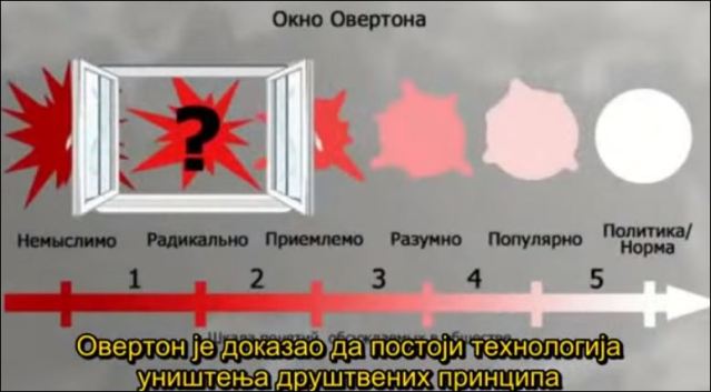 Јер, ако некоме то буде у интересу, провући ће и Вас и друштво коме припадате кроз процедуру звану ПРОЗОР ОВЕРТОНА, па ћете расправљати, ПОТПУНО УБЕЂЕНИ ДА ТО НИЈЕ НИШТА СТРАШНО, кроз десетак година, да ли је боља шницла или крменадла од човека? А ако, тада, када то буде општеприхваћено, будете неки „чудак“ који се канибализму јавно супроставља, врло је вероватно да бисте „заглавили“ у затвору! Ми смо већ изложени процедурама промене свести које нам, од, у почетку потпуно неприхватљивих појава, стварају атмосферу да оне постају, не само природне, већ и законом заштићене.