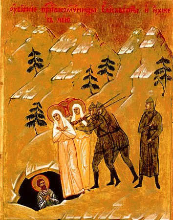 Касно у ноћ 5. (18.) јула, на дан обретења моштију преподобног Сергија Радоњешког, велика кнегиња Јелисавета Фјодоровна је заједно са другим члановима царског дома бачена у шахту старог рудника. Кад су подивљали џелати гурали велику кнегињу у црну јаму, она је понављала молитву, коју је на Крсту изговорио распети Спаситељ света: “Господе, опрости им, јер не знају шта чине” (Лк. 23, 34). Затим чекисти почеше да бацају у шахту ручне гранате. Један сељак који је био сведок убиства говорио је да су се из дубине шахте још дуго чули звуци Херувимске песме, коју су страдалници певали пред олазак у вечност.