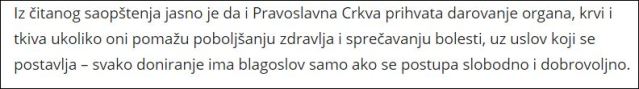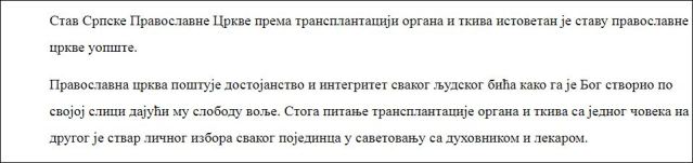 *СПЦ – „Православна црква поштује достојанство и интегритет сваког људског бића како га је Бог створио по својој слици дајући му слободу воље. Стога питање трансплантације органа и ткива са једног човека на другог је ствар личног избора сваког појединца у саветовању са духовником и лекаром.“